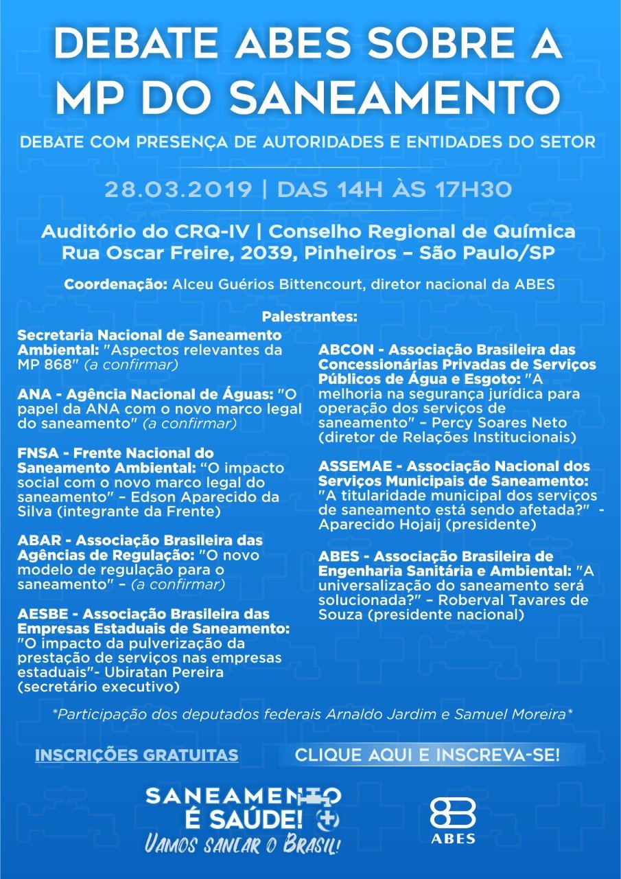 A Associação Brasileira de Engenharia Sanitária e Ambiental – ABES promoverá, no dia 28 de março, das 14h às 17h30, no auditório do CRQ (Conselho Regional de Química), em São Paulo/SP, o Debate sobre a Medida Provisória 868/2018, que altera o marco legal do saneamento básico. O evento contará com a participação de autoridades e entidades do setor (veja a programação abaixo). A participação é gratuita. As inscrições estão abertas neste link: http://abeseventos.org.br/2019/02/22/mpsaneamento/