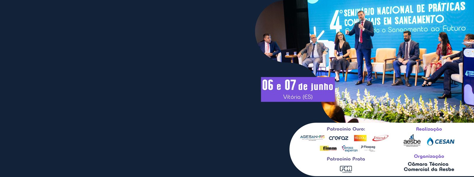O 4º Seminário Nacional de Práticas Comerciais teve início hoje (6) em Vitória/ES, destacando-se como um importante fórum de discussão sobre os avanços e desafios no setor de saneamento básico no Brasil. O evento começou às 9h com a solenidade de abertura, que reuniu autoridades do setor.. A mesa de abertura foi composta por Munir Abud, presidente da Cesan e vice-presidente Regional Sudeste da Aesbe; Sergio Gonçalves, secretário executivo da Aesbe; Leonardo Picciani, secretário nacional de Saneamento Ambiental do Ministério das Cidades; Agostinho Moreira, coordenador da Câmara Técnica Comercial; Thalita Vieira, secretária da Câmara Técnica Comercial, Bruna de Paula e Danilo Raposo, promotores de Justiça do Espírito Santo.